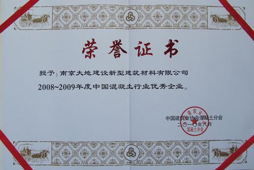 2010年8月初,中国建筑业协会混凝土分会在上海召开了中国混凝土行业优秀企业、优秀企业家表彰大会,南京平博在线官网建设新型建筑材料有限平博在线平台再次被授予“2008~2009年度中国混凝土行业优秀企业”荣誉称号。