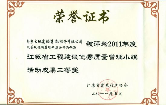 近日由江苏省建筑行业协会组织的“2011年度江苏省工程建设优秀QC成果评选”活动中,股份平博在线平台佳日雅苑项目部的《改善现浇钢筋混凝土屋面渗漏缺陷》获得2011年度江苏省工程建设优秀质量管理小组活动成果二等奖。此次评选活动是经具有全国工程建设优秀QC小组活动诊断师资格的专家严格审阅、评分及评委会审定的结果。继此次获奖后,股份平博在线平台项目部及QC小组表示将继续努力、不断创新,为进一步提高建设工程质量管理水平和企业综合素质作出新的贡献。
