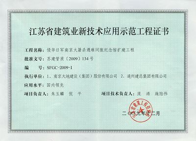 我平博在线平台承建的“侵华日军南京大屠杀遇难同胞纪念馆扩建工程”于09年下半年通过了第六批全国建筑业新技术应用示范工程的专家评审,结论为:应用新技术的整体水平达到“国内领先水平”。另外,本工程还被江苏省建管局批准为“江苏省第一批绿色施工示范工程”。该工程应用了建设部“建筑业十项新技术”的10大项17小项,江苏省新技术4项,创新技术3项。该工程于近日取得了“江苏省建筑业新技术应用示范工程证书”。