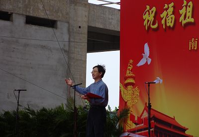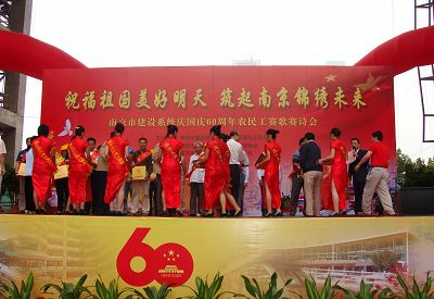 此次活动由市建委、市建工局主办,市总工会、市园林局、市市政公用局、市市容局、南京日报社协办。参加演出的演员都是来自建设、生产一线的农民工,他们充满激情,通过诗朗诵《激情咏颂我的祖国》、《祖国啊,我为你自豪》、《南京,我可爱的第二故乡》、《我们爱你啊,南京》,以及男声独唱《农民兄弟》、合唱《歌唱祖国》等精彩的节目,充分表达了爱国热情。 |