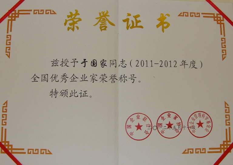 集团平博在线平台董事长于国家荣获“全国优秀企业家”殊誉