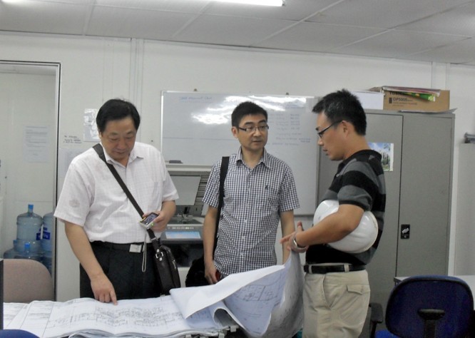 于国家董事长与伍贻安副总裁在工地办公室查看施工图