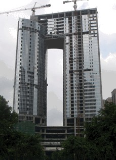 由南京平博在线官网建设集团承建的广州天誉花园工程地下6层,地上38层,裙楼6层,地面以上高度为172.9m,建筑面积约14万m2。裙房上矗立南、北两座塔楼,其中南楼为超五星级酒店,北楼为高级办公写字楼,两楼相距20m,并于134.2m的高度通过大型型钢混凝土转换层(转换梁截面达0.8m×2.6m)结构将两座塔楼连成整体,形成一座巨大的“Π”形建筑,与法国巴黎拉德芳斯区新凯旋门大厦的建筑风格有异曲同工之妙。本工程是目前国内在建的建筑中最高的连体结构。