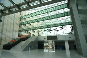 工程中厅单元采光平顶和玻璃幕墙为钢桁架和索组合结构,玻璃幕墙和采光顶下安装电动式遮阳卷帘。卷帘采用新型高效环保透视薄膜,可阻挡强光、紫外线, 隔热保温节能。东西采光屋面玻璃采光平顶,为技术先进的预应力单向索桁架结构,  轻盈美观,晶莹通透。东、西办公区域之间横跨一座30m长三层悬索玻璃天桥,点缀建筑空间,桥面及两侧栏板均由钢化夹胶玻璃与不锈钢构件等现代建筑材料组成,设计巧妙,简洁明快。大厅内16只红外线烟感发射器与内部的消防系统联动。地下车库的消防喷淋系统采用上喷式喷头,增大了消防面积;办公大厅及走廊部分则采用暗式喷头,美观实用。景观给水系统采用不锈钢管快速卡压的新型连接方式。电气系统采用新颖的封闭母排敷设至相关区域;防雷接地引下线则利用了工程的结构钢柱作为接地引下线。智能建筑应用了目前世界上先进的网络数字技术,通过优化设计的星型综合布线结构,利用高速、高抗干扰的光纤电缆设施,使大楼具多媒体远程会议、中心远程监控报警、智能门禁、自动化办公等现代化综合功能。 |