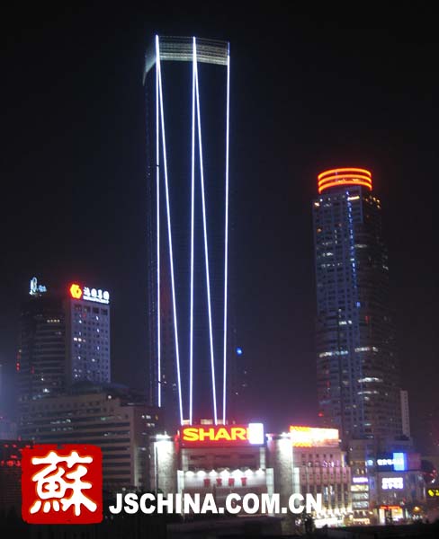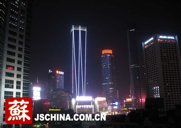 位于南京市中心的新百新大楼在夜晚发出璀璨的光芒,点缀着南京的夜空。