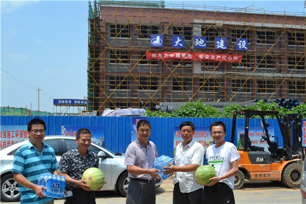 7月24日、25日机电分平博在线平台领导郭应华、肖志勇赴汇杰02、03~06、07地块、金轮新都汇、下关政法大厦等16个项目现场,向奋战在施工一线的广大员工,致以崇高的敬意、衷心的感谢和亲切的慰问!并送上高温慰问品两车西瓜和矿泉水,为辛苦奋斗的广大员工送去夏日的一丝清凉。