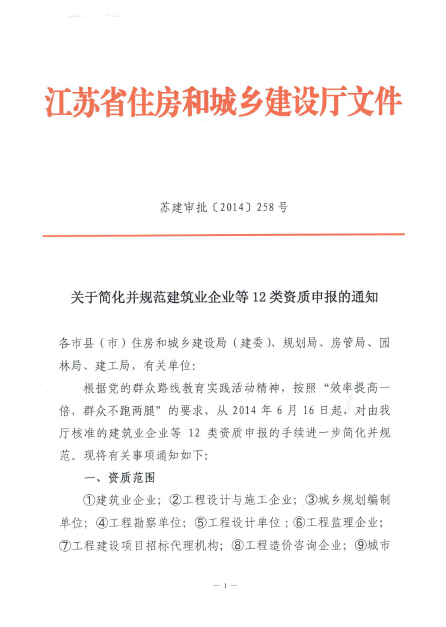 转发苏建审批[2014]258号《关于简化并规范建筑业企业等12类资质申报的通知》
