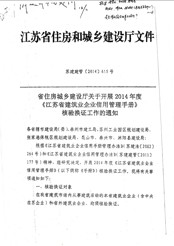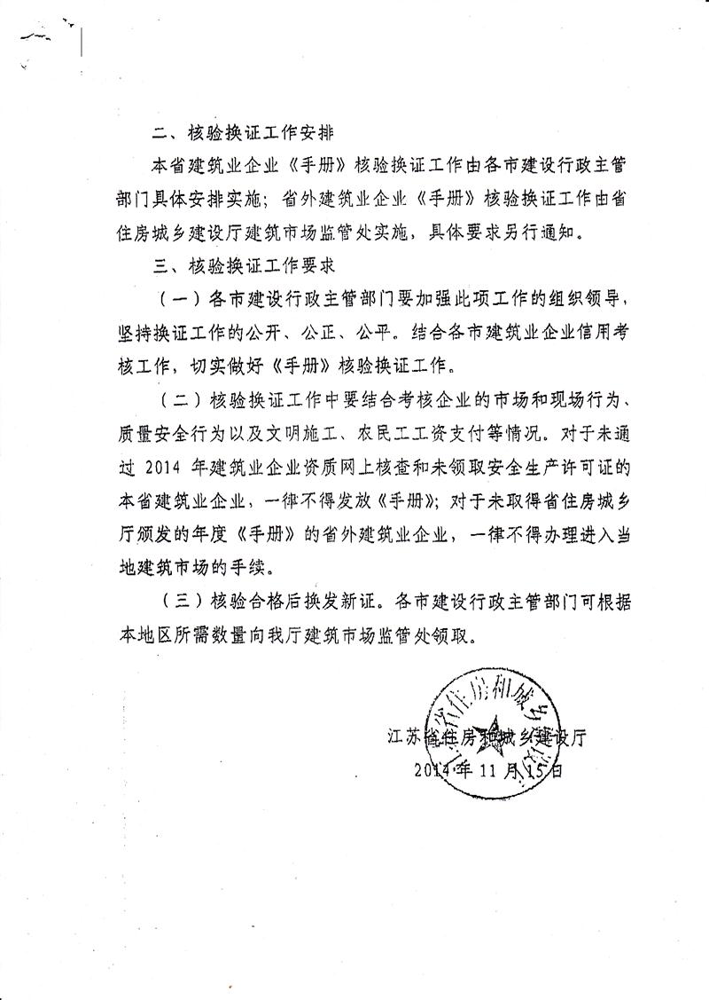 省住房城乡建设厅关于开展2014年度《江苏省建筑业企业信用管理手册》核验换证工作的通知