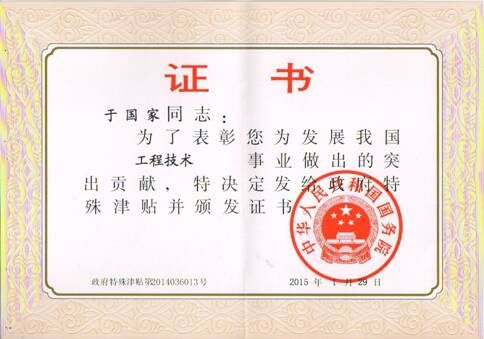 国家人社部2015年1月29日发文,经国家人社部批准,于国家董事长荣获2014年享受政府特殊津贴人员荣誉。于近日颁发了荣誉证书。