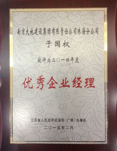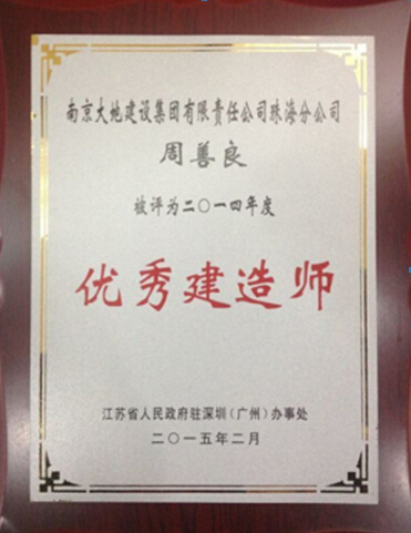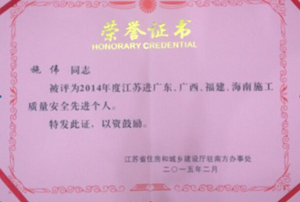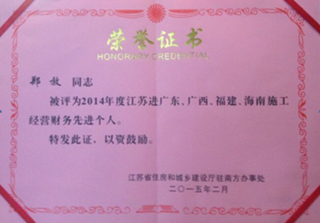 2015年2月6日,江苏省住房和城乡建设厅驻南方办事处2015年1号文件2号文件中对江苏省进广东、广西、福建、海南建筑施工先进企业及个人进行表彰。其中,平博在线平台珠海分平博在线平台荣获施工先进企业、于国权同志荣获施工企业优秀企业经理称号、周善良同志荣获施工企业优秀建造师、施伟同志荣获质量安全先进个人、郑放同志荣获经营财务先进个人等共五项荣誉奖项。