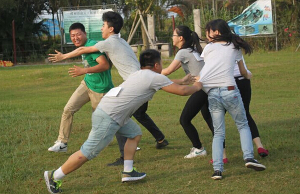 拓展训练的现场洋溢着紧张、欢乐的气氛。开场的破冰游戏让小伙伴们抛开工作烦恼,消除同事之间的隔膜,投入到拓展训练中来。握手拥抱互相熟悉之后,拓展教练将参加人员分为两个组,规定在有限时间内由队员选出来的队长要带领大家确定出队名、队伍口号和队歌,大家迅速融入其中。两个小组分别取名为“余家帮”和“超能陆战队”,余家帮的队歌《团结就是力量》铿锵有力,而超能陆战队的队歌《青春修炼手册》则胜在青春活力“萌萌哒”。两队在队伍士气展示环节也是激情高昂、不相伯仲。