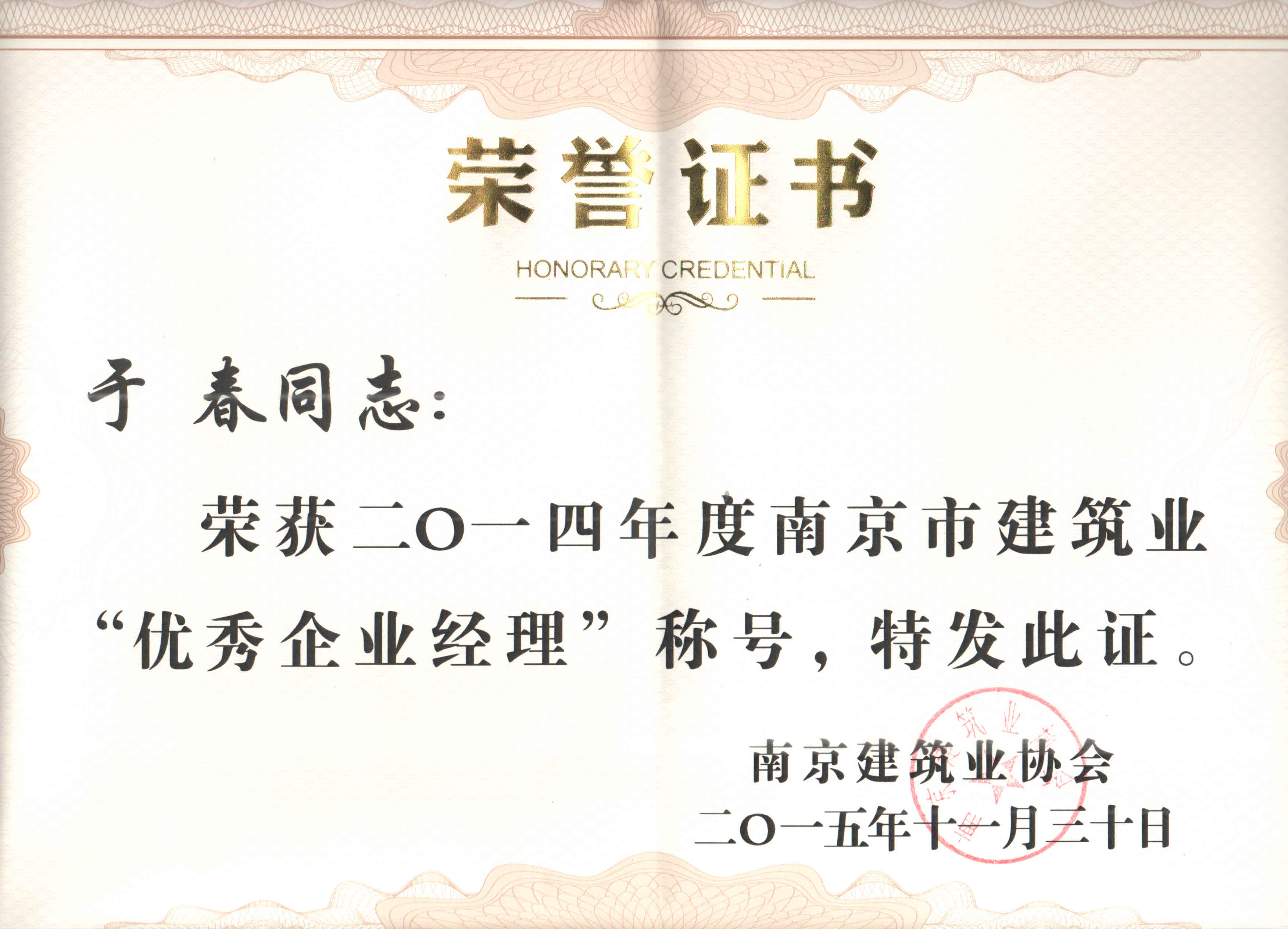 我平博在线平台荣获南京市建筑业优秀企业,于春荣获优秀企业经理荣誉称号
