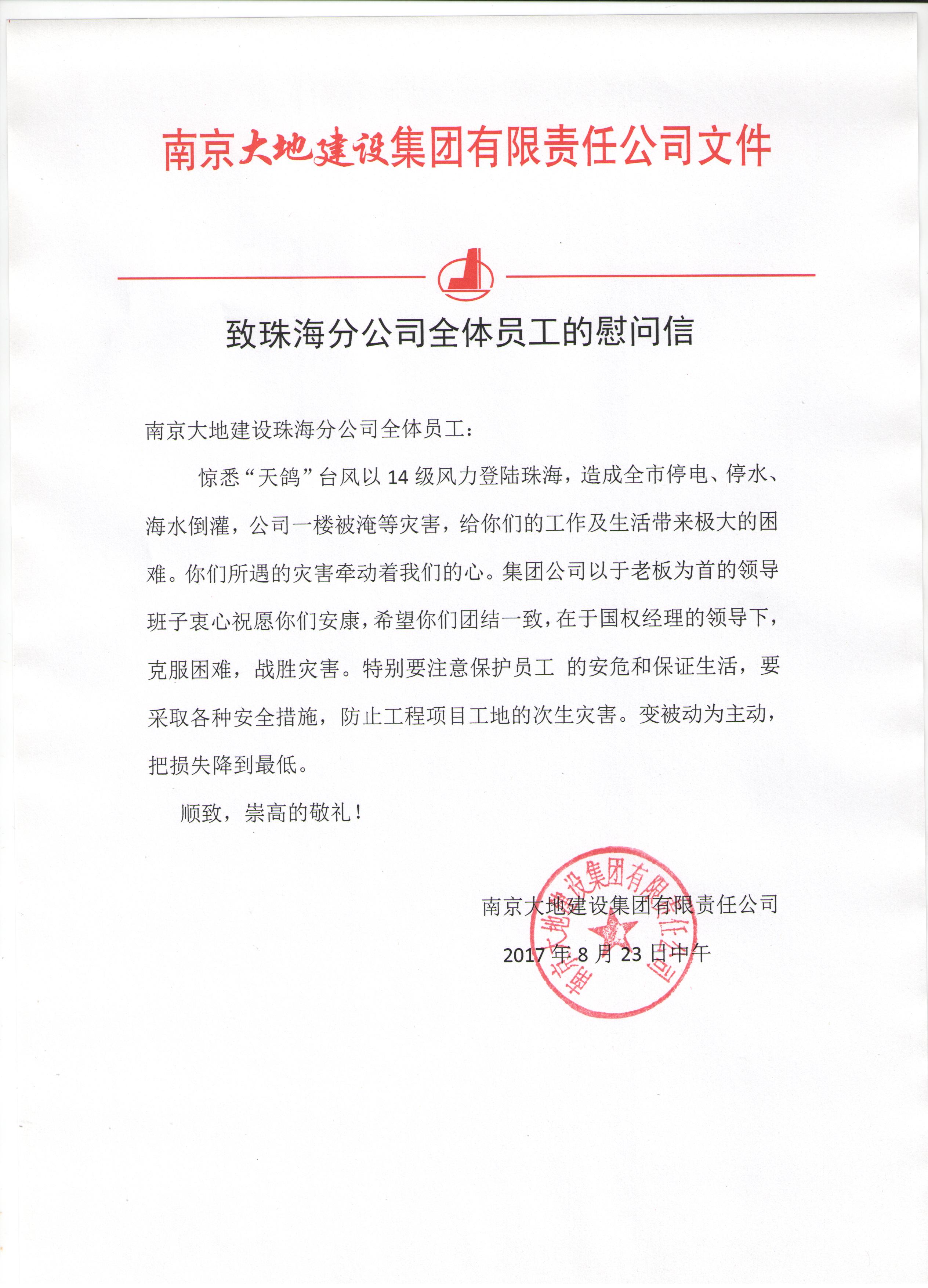 “天鸽”台风过后,集团平博在线平台致珠海分平博在线平台全体员工的慰问信