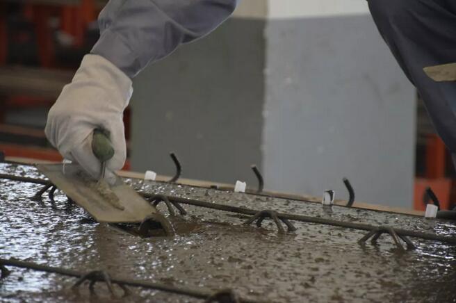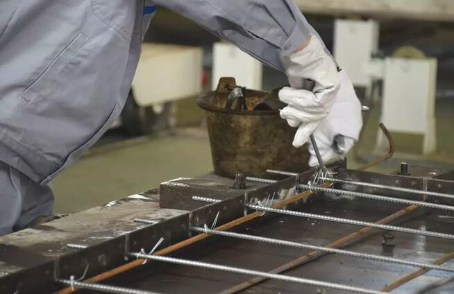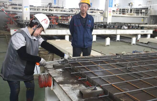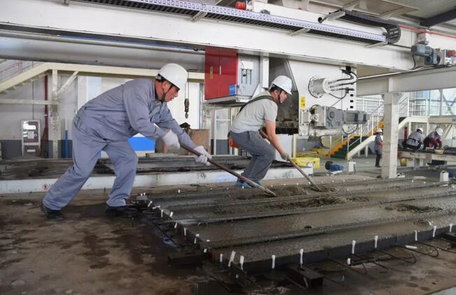 工厂里的布料机将混凝土铺料完,振动台振捣,使混凝土密实结合,消除混凝土的蜂窝麻面,提高强度。 完成这一系列工序后,张师傅又爬上了振动台,仔细的进行补料和砼表面处理。张师傅说:“以前这些工序都是手工作业,用震动棒、震动平台板,在猛烈的电动机动力下,我们工人抓它的手臂被震得特别酸麻,吃饭时都几乎端不起饭碗来。现在工厂实现了机械化、智能化生产,大型的振动台,上手更快,工作强度也小了,比以前轻松很多。”