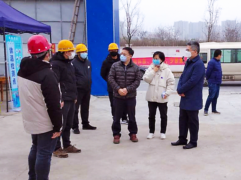 2020年3月1日,一中分校项目迎来了疫情防控下正式复工的第一天,建邺区区委书记沈剑荣、区副区长孙小军、区建设局局长丁玉君以及区政府办和区质安站领导一行来到一中分校项目,调研检查指导该项目疫情防控和复工生产工作。一中分校项目负责人桂在友及主要管理骨干在现场迎接调研。