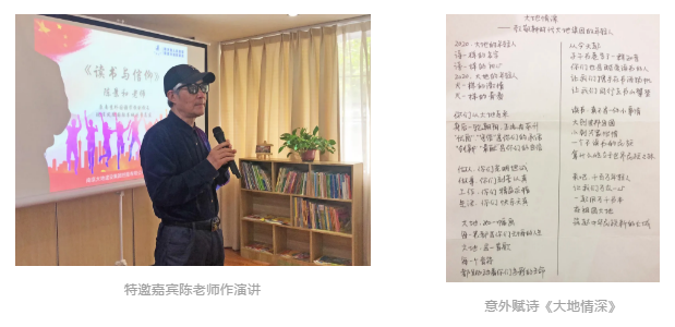 此次活动中,特约嘉宾陈景和老师分享了《读书与信仰》主题演讲,通过一个又一个“小故事”,深入浅出的诠释了读书与信仰对人生、对社会、对历史的意义。并准备了一首原创“小诗”《平博在线官网情深》谨以此献给“火一样”的平博在线官网青年。