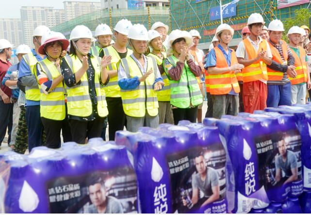 “工作时需要大量喝水,你们送来这么多饮用水真是解我们所需!特别感谢你们!”而身旁刚工作完满头大汗的工人梅仁海双手拿满了水,不断地道谢。